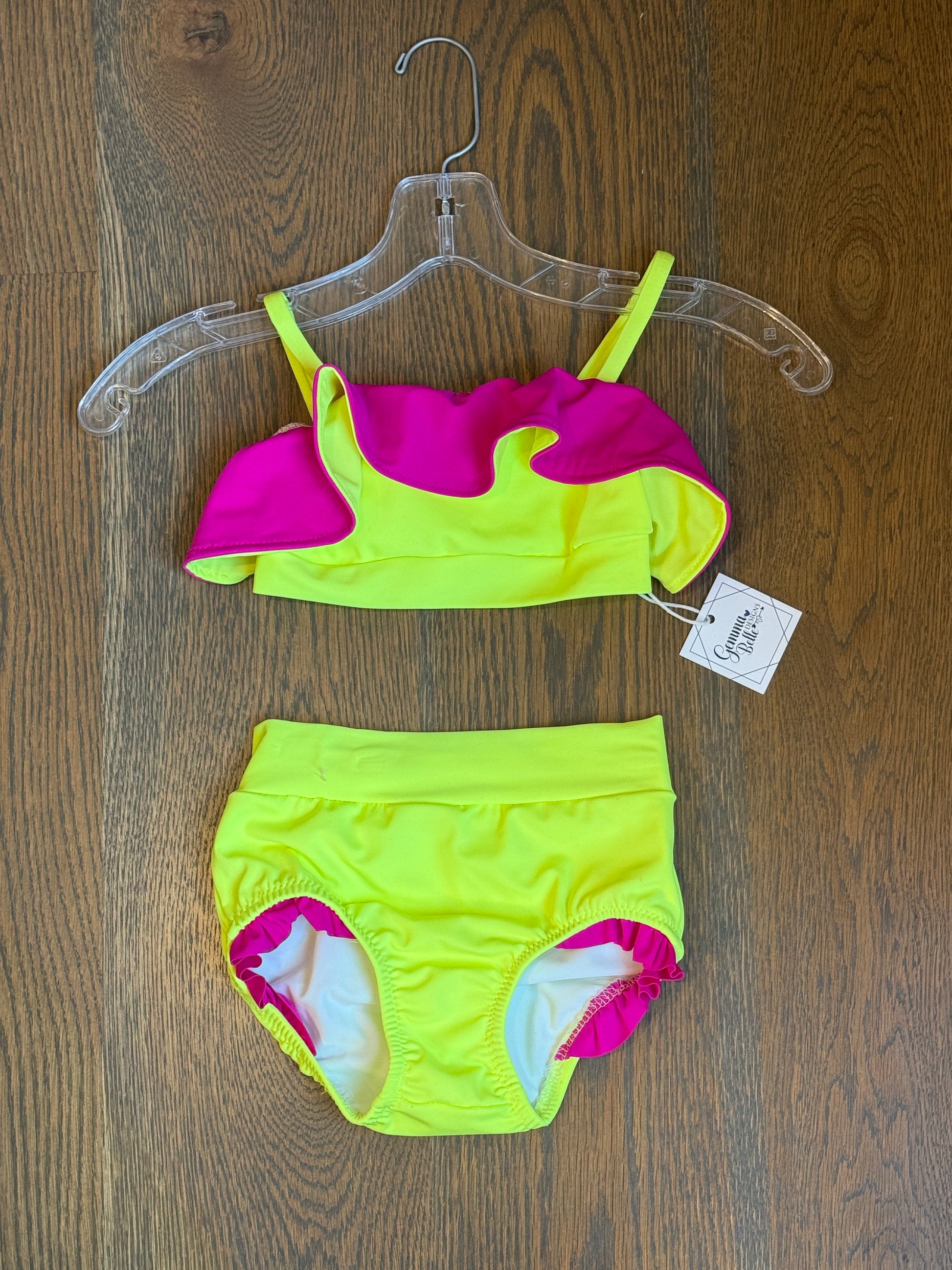 Bandeau style top with attached ruffled and spaghetti straps. Matching briefs. Both pieces fully lined