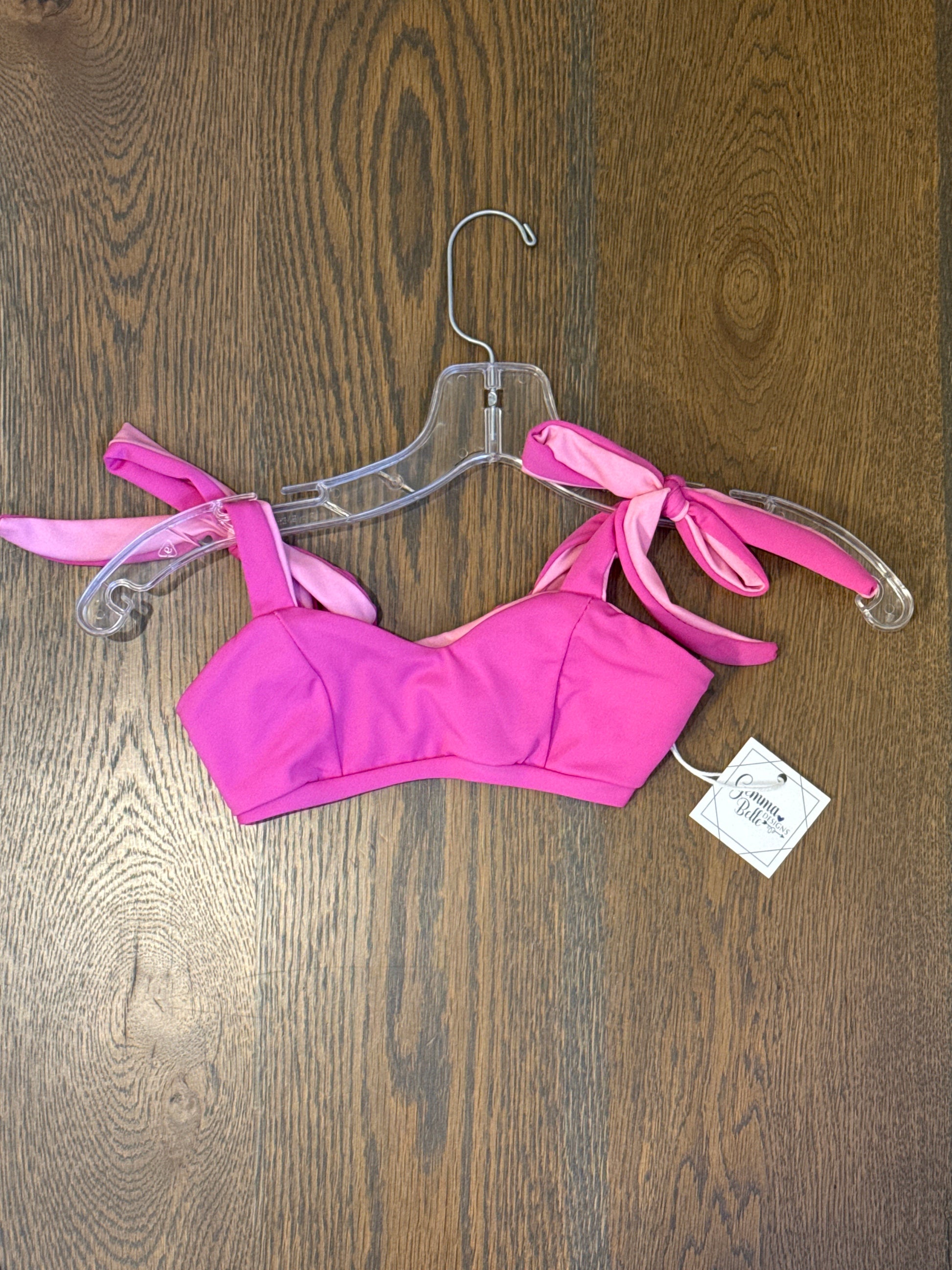 Bandeau style top with princess seams and tie straps. Lined front and back