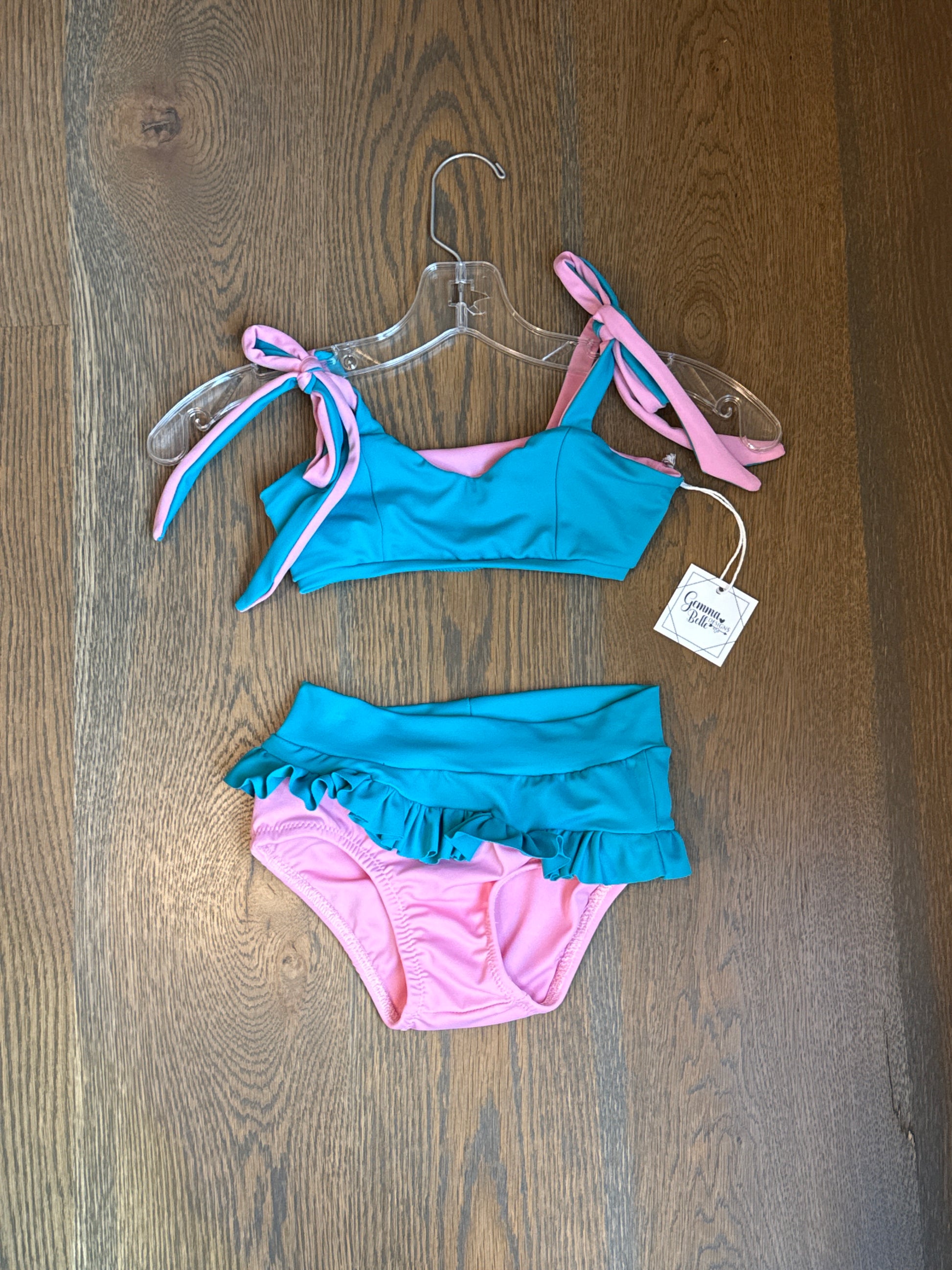 Tie princess cut top with diagonal cut briefs and ruffles. Top and briefs fully lined.