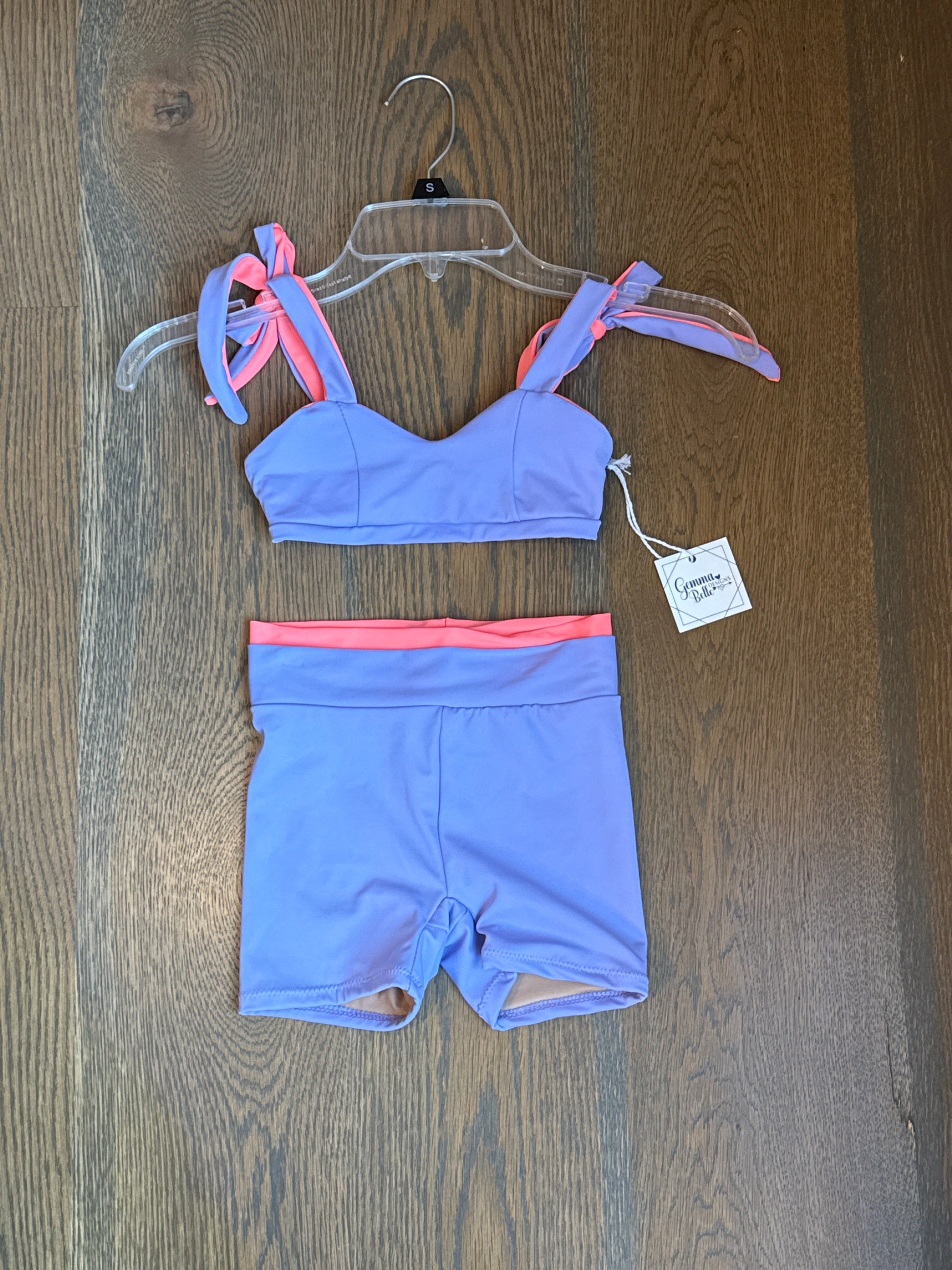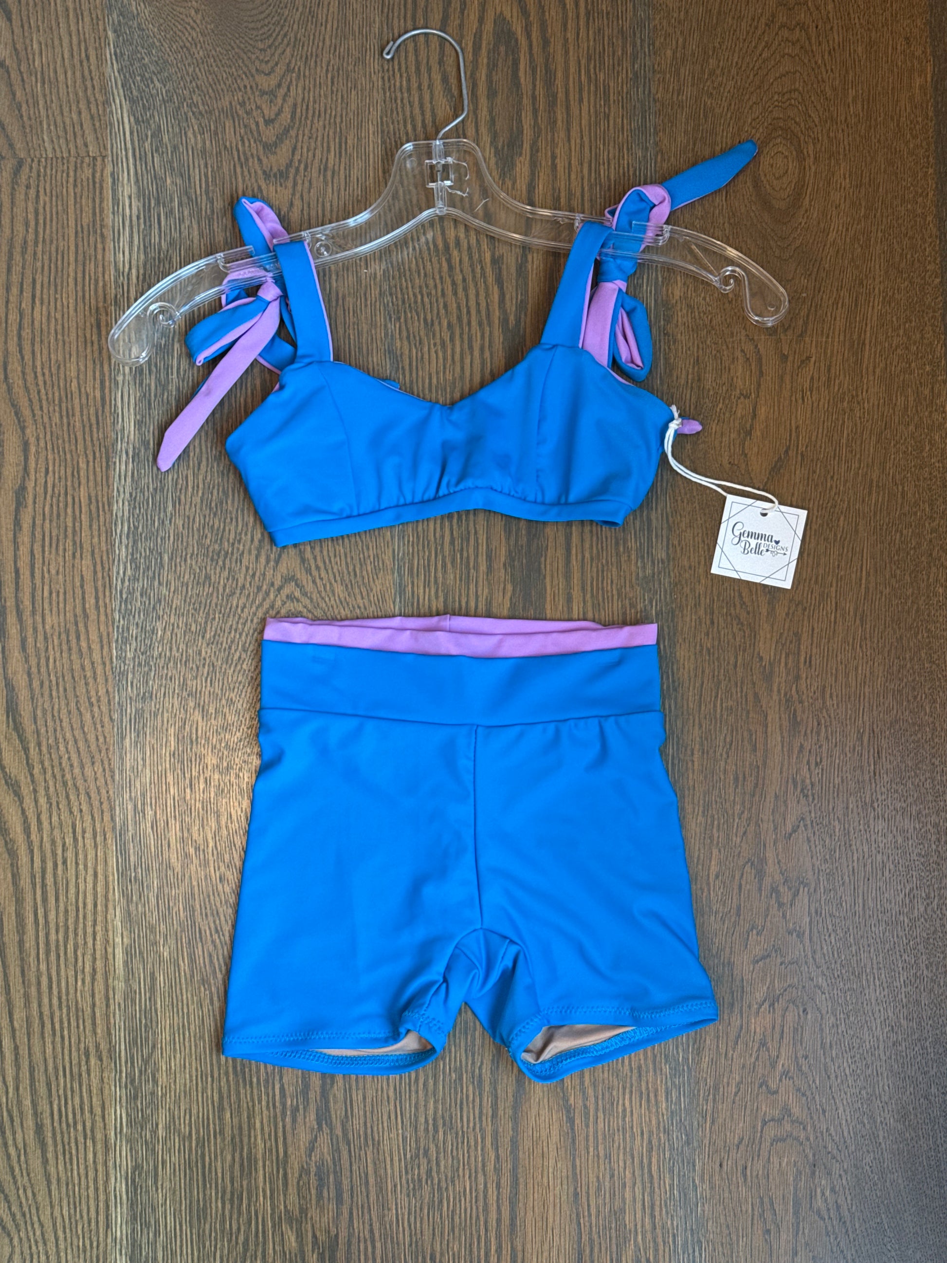Primrose top with tie shoulders for a custom fit! Bikers with small ruffle at the waistline. Top and bottom fully lined